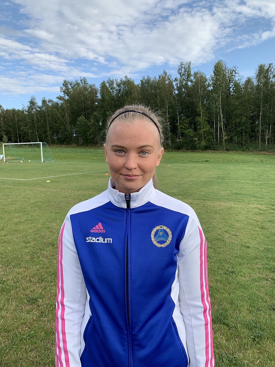 19 åringen ansluter till vår trupp! Hon spelar i första hand på yttermittfältet eller som forward. Har spelat hela sitt liv i Kvibille BK. Hon har gått på fotbollsgymnasiet på Aspero med inriktning Samhälle/beteende. Hon jobbar på ett elektronikföretag på ledig tid men pluggar annars på Högskolan till sjuksköterska. Vi hälsar henne välkommen!